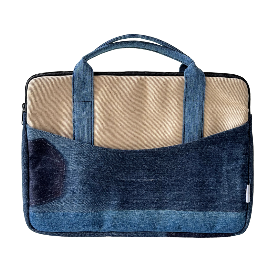 Designed to protect and carry your laptop with ease, this bag is perfect for work or travel. Made from durable cotton canvas and upcycled denim waste with a touch of traditional elegance.