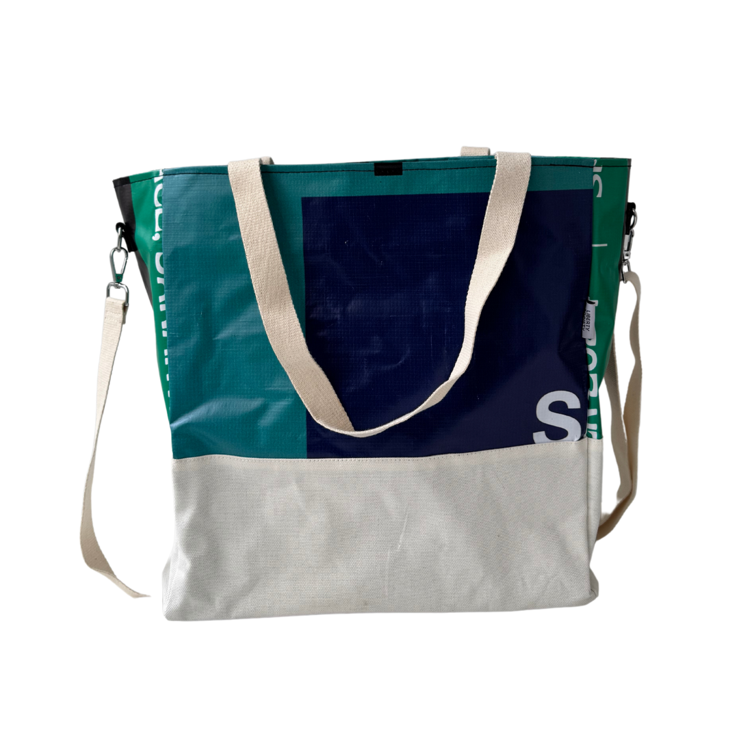 Made from upcycled banner waste, combined with the durable canvas material. Perfect for daily errands or casual outings. Includes custom logo option.